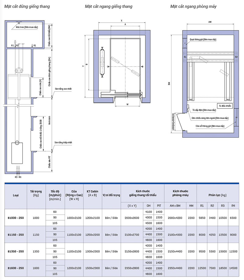 - Tải trọng: Từ 750kg đến 1600kg (phù hợp cho 10 – 24 người hoặc giường bệnh).