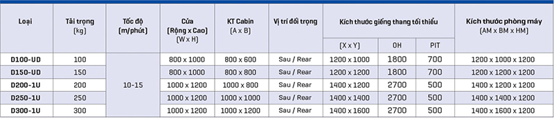 - Các tải trọng phổ biến: 50Kg, 70Kg, 100Kg. Loại 50Kg còn được gọi là thang máy tải thực phẩm mini, phổ biến tại quán ăn và quán cafe.